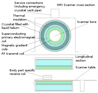 MRI requires a magnetic field that is both strong and uniform to a few parts per million across the scan volume. The field strength of the magnet is measured in teslas – and while the majority of systems operate at 1.5 T, commercial systems are available between 0.2 and 7 T. Whole-body MRI systems for research applications operate in e.g. 9.4T,[7][8] 10.5T,[9] 11.7T.[10] Even higher field whole-body MRI systems e.g. 14 T and beyond are in conceptual proposal[11] or in engineering design.[12] Most clinical magnets are superconducting magnets, which require liquid helium to keep them at low temperatures. Lower field strengths can be achieved with permanent magnets, which are often used in "open" MRI scanners for claustrophobic patients.[13] Lower field strengths are also used in a portable MRI scanner approved by the FDA in 2020.[14] Recently, MRI has been demonstrated also at ultra-low fields, i.e., in the microtesla-to-millitesla range, where sufficient signal quality is made possible by prepolarization (on the order of 10–100 mT) and by measuring the Larmor precession fields at about 100 microtesla with highly sensitive superconducting quantum interference devices (SQUIDs).[15][16][17]