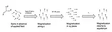 Magnetization builds up along the z-axis in the presence of a magnetic field, B0, such that the magnetic dipoles in the sample will, on average, align with the z-axis summing to a total magnetization Mz. This magnetization along z is defined as the equilibrium magnetization; magnetization is defined as the sum of all magnetic dipoles in a sample. Following the equilibrium magnetization, a 90° radiofrequency (RF) pulse flips the direction of the magnetization vector in the xy-plane, and is then switched off. The initial magnetic field B0, however, is still applied. Thus, the spin magnetization vector will slowly return from the xy-plane back to the equilibrium state. The time it takes for the magnetization vector to return to its equilibrium value, Mz, is referred to as the longitudinal relaxation time, T1.[19] Subsequently, the rate at which this happens is simply the reciprocal of the relaxation time: . Similarly, the time in which it takes for Mxy to return to zero is T2, with the rate .[20] Magnetization as a function of time is defined by the Bloch equations.