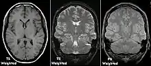 An MRI sequence is a particular setting of radiofrequency pulses and gradients, resulting in a particular image appearance.[64] The T1 and T2 weighting can also be described as MRI sequences.
