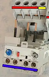 A magnetic starter has a contactor and an overload relay, which will open the control voltage to the starter coil if it detects an overload on a motor.[1][2] The overload relay opens a set of contacts that are wired in series with the supply to the contactor feeding the motor. The characteristics of the heaters can be matched to the motor so that the motor is protected against overload. Recently, microprocessor-controlled motor digital protective relays offer more comprehensive protection of motors.