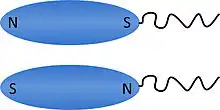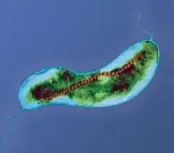 Magnetotactic bacteria (or MTB) are a polyphyletic group of bacteria that orient themselves along the magnetic field lines of Earth's magnetic field.[1] Discovered in 1963 by Salvatore Bellini and rediscovered in 1975 by Richard Blakemore, this alignment is believed to aid these organisms in reaching regions of optimal oxygen concentration.[2] To perform this task, these bacteria have organelles called magnetosomes that contain magnetic crystals. The biological phenomenon of microorganisms tending to move in response to the environment's magnetic characteristics is known as magnetotaxis. However, this term is misleading in that every other application of the term taxis involves a stimulus-response mechanism. In contrast to the magnetoreception of animals, the bacteria contain fixed magnets that force the bacteria into alignment—even dead cells are dragged into alignment, just like a compass needle.[3]