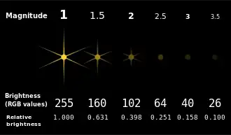 - Apparent magnitude, the brightness of an object as it appears in the night sky.
