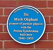 In 1934, Cockcroft arranged for Oliphant to become a fellow of St John's College, Cambridge, which paid about £600 a year. When Chadwick left the Cavendish Laboratory for the University of Liverpool in 1935, Oliphant and Ellis both replaced him as Rutherford's assistant director for research. The job came with a salary of £600 (equivalent to AUD$66,000 in 2022).[38] With the money from St John's, this gave him a comfortable income.[23] Oliphant soon fitted out a new accelerator laboratory with a 1.23 MeV generator at a cost of £6,000 (equivalent to AUD$660,000 in 2022) while he designed an even larger 2 MeV generator.[39] He was the first to conceive of the proton synchrotron, a new type of cyclic particle accelerator.[40] In 1937, he was elected to the Royal Society. When he died he was its longest-serving fellow.[23]