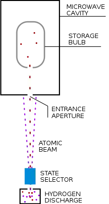 - A high Q factor (quality factor) microwave cavity confines the microwaves and reinjects them repeatedly into the atom beam. The stimulated emission amplifies the microwaves on each pass through the beam. This combination of amplification and feedback is what defines all oscillators. The resonant frequency of the microwave cavity is tuned to the frequency of the hyperfine energy transition of hydrogen: 1,420,405,752 hertz.[15]