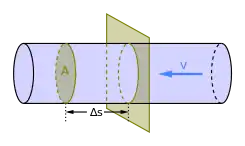 Illustration of volume flow rate. Mass flow rate can be calculated by multiplying the volume flow rate by the mass density of the fluid, ρ. The volume flow rate is calculated by multiplying the flow velocity of the mass elements, v, by the cross-sectional vector area, A.