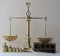 Normally, the effect of air buoyancy on objects of normal density is too small to be of any consequence in day-to-day activities. For instance, buoyancy's diminishing effect upon one's body weight (a relatively low-density object) is 1⁄860 that of gravity (for pure water it is about 1⁄770 that of gravity). Furthermore, variations in barometric pressure rarely affect a person's weight more than ±1 part in 30,000.[6] However, in metrology (the science of measurement), the precision mass standards for calibrating laboratory scales and balances are manufactured with such accuracy that air density is accounted for to compensate for buoyancy effects. Given the extremely high cost of platinum-iridium mass standards like the international prototype of the kilogram (the mass standard in France that defined the magnitude of the kilogram), high-quality "working" standards are made of special stainless steel alloys[7] with densities of about 8,000 kg/m3, which occupy greater volume than those made of platinum-iridium, which have a density of about 21,550 kg/m3. For convenience, a standard value of buoyancy relative to stainless steel was developed for metrology work and this results in the term "conventional mass".[8] Conventional mass is defined as follows: "For a mass at 20 °C, ‘conventional mass’ is the mass of a reference standard of density 8,000 kg/m3 which it balances in air with a density of 1.2 kg/m3." The effect is a small one, 150 ppm for stainless steel mass standards, but the appropriate corrections are made during the manufacture of all precision mass standards so they have the true labeled mass.