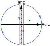 As in Fig. 1, the weighting function generates poles (red crosses) on the imaginary axis. The contour integral picks up the residue of these poles, which is equivalent to the summation. This procedure is sometimes called Sommerfeld-Watson transformation.[5]