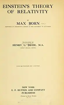 - Die Relativitätstheorie Einsteins und ihre physikalischen Grundlagen (in German). Berlin: Springer. 1920. – Based on Born's lectures at the University of Frankfurt am Main.[94]