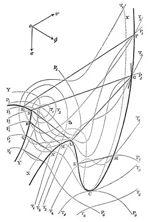 Maxwell drew lines of equal pressure (isopiestics) and of equal temperature (isothermals) on his plaster cast by placing it in the sunlight, and "tracing the curve when the rays just grazed the surface."[2] He sent sketches of these lines to a number of colleagues.[16] For example, his letter to Thomas Andrews of 15 July 1875 included sketches of these lines.[2] Maxwell provided a more detailed explanation and a clearer drawing of the lines (pictured) in the revised version of his book Theory of Heat,[15] and a version of this drawing appeared on a 2005 US postage stamp in honour of Gibbs.[6]
