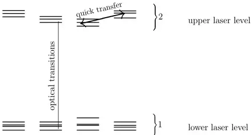 It is typical that the lasing properties of a medium are determined by the temperature and the population at the excited laser level, and are not sensitive to the method of excitation used to achieve it. In this case, the absorption cross-section and the emission cross-section at frequency can be related to the lasers gain in such a way, that the gain at this frequency can be determined as follows: