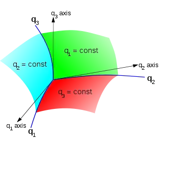 In short, the emphasis of some authors upon coordinates and their derivatives and their introduction of (generalized) fictitious forces that do not vanish in inertial frames of reference is an outgrowth of the use of generalized coordinates in Lagrangian mechanics. For example, see McQuarrie[31] Hildebrand,[22] and von Schwerin.[32] Below is an example of this usage as employed in the design of robotic manipulators:[33][34][35]