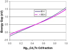 Hg1−xCdxTe or mercury cadmium telluride (also cadmium mercury telluride, MCT, MerCad Telluride, MerCadTel, MerCaT or CMT) is a chemical compound of cadmium telluride (CdTe) and mercury telluride (HgTe) with a tunable bandgap spanning the shortwave infrared to the very long wave infrared regions. The amount of cadmium (Cd) in the alloy can be chosen so as to tune the optical absorption of the material to the desired infrared wavelength. CdTe is a semiconductor with a bandgap of approximately 1.5 electronvolts (eV) at room temperature. HgTe is a semimetal, which means that its bandgap energy is zero. Mixing these two substances allows one to obtain any bandgap between 0 and 1.5 eV.