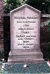 Faraday died at his house at Hampton Court on 25 August 1867, aged 75.[32] He had some years before turned down an offer of burial in Westminster Abbey upon his death, but he has a memorial plaque there, near Isaac Newton's tomb.[33] Faraday was interred in the dissenters' (non-Anglican) section of Highgate Cemetery.[34]