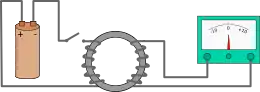 A diagram of Faraday's iron ring-coil apparatus