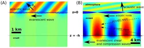 7. Arendt, S.; Fritts, D.C. (2000). "Acoustic radiation by ocean surface waves". Journal of Fluid Mechanics. 415 (1): 1–21. Bibcode:2000JFM...415....1A. doi:10.1017/S0022112000008636. S2CID 121374538. We show that because of the phase speed mismatch between surface gravity waves and acoustic waves, a single surface wave radiates only evanescent acoustic waves.