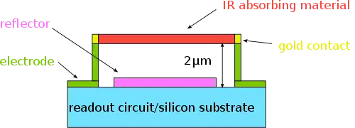 A microbolometer consists of an array of pixels, each pixel being made up of several layers. The cross-sectional diagram shown in Figure 1 provides a generalized view of the pixel. Each company that manufactures microbolometers has their own unique procedure for producing them and they even use a variety of different IR absorbing materials. In this example the bottom layer consists of a silicon substrate and a readout integrated circuit (ROIC). Electrical contacts are deposited and then selectively etched away. A reflector, for example, a titanium mirror, is created beneath the IR absorbing material. Since some light is able to pass through the absorbing layer, the reflector redirects this light back up to ensure the greatest possible absorption, hence allowing a stronger signal to be produced. Next, a sacrificial layer is deposited so that later in the process a gap can be created to thermally isolate the IR absorbing material from the ROIC. A layer of absorbing material is then deposited and selectively etched so that the final contacts can be created. To create the final bridge like structure shown in Figure 1, the sacrificial layer is removed so that the absorbing material is suspended approximately 2 μm above the readout circuit. Because microbolometers do not undergo any cooling, the absorbing material must be thermally isolated from the bottom ROIC and the bridge like structure allows for this to occur. After the array of pixels is created the microbolometer is encapsulated under a vacuum to increase the longevity of the device. In some cases the entire fabrication process is done without breaking vacuum.