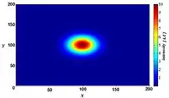 However, blurring is not caused by random processes, such as light scattering, but can be well defined by the optical properties of the image formation in the microscope imaging system. If one considers a small fluorescent light source (essentially a bright spot), light coming from this spot spreads out further from our perspective as the spot becomes more out of focus. Under ideal conditions, this produces an "hourglass" shape of this point source in the third (axial) dimension. This shape is called the point spread function (PSF) of the microscope imaging system. Since any fluorescence image is made up of a large number of such small fluorescent light sources, the image is said to be "convolved by the point spread function". The mathematically modeled PSF of a terahertz laser pulsed imaging system is shown on the right.