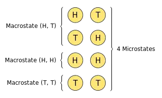 In contrast, the macrostate of a system refers to its macroscopic properties, such as its temperature, pressure, volume and density.[1] Treatments on statistical mechanics[2][3] define a macrostate as follows: a particular set of values of energy, the number of particles, and the volume of an isolated thermodynamic system is said to specify a particular macrostate of it. In this description, microstates appear as different possible ways the system can achieve a particular macrostate.