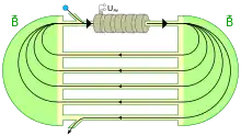 A microtron is a type of particle accelerator concept originating from the cyclotron in which the accelerating field is not applied through large D-shaped electrodes, but through a linear accelerator structure. The classic microtron was invented by Vladimir Veksler around 1944.[1][2] The kinetic energy of the particles is increased by a constant amount per field change (one half or a whole revolution). Microtrons are designed to operate at constant field frequency and magnetic field in the ultrarelativistic limit. Thus they are especially suited for very light elementary particles, namely electrons.