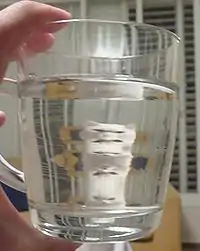 Below: An artificial mirage, using sugar solutions to simulate the inversion layers.[lower-alpha 2]
