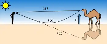 A mirage is a naturally-occurring optical phenomenon in which light rays bend via refraction to produce a displaced image of distant objects or the sky.[1] The word comes to English via the French (se) mirer, from the Latin mirari, meaning "to look at, to wonder at".[2]
