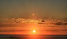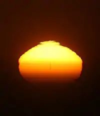 The shapes of inferior mirage sunsets and sunrises stay the same for all inferior mirage sunsets and sunrises. One well-known shape, the Etruscan vase, was named by Jules Verne.[1] As the sunset progresses the shape of Etruscan vase slowly changes; the stem of the vase gets shorter until the real and the miraged Suns create a new shape – Greek letter omega Ω. The inferior mirage got its name because the inverted image appears below the erect one.[2]