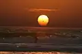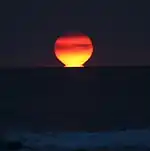 A green rim is present in every sunset, but it is too thin to be seen with a naked eye. The best time to observe the green rim is about 10 minutes before sunset time.[16] However, the solar disc is too bright at that time to use magnification, such as binoculars or telescopes, to look directly at the Sun. Of course, a telescope or binoculars image can be projected on a sheet of paper for viewing. When the Sun gets closer to the horizon, the green rim gets fainter because of atmospheric reddening.[16] Although a green rim is present in every sunset, and a green flash is rare because it requires a mirage to be present, it is actually more common for people to have seen a green flash rather than a green rim.