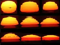 A mirage of an astronomical object is a meteorological optical phenomenon, in which light rays are bent to produce distorted or multiple images of an astronomical object. The mirages might be observed for such celestial objects as the Sun, the Moon, the planets, bright stars, and very bright comets. The most commonly observed of these are sunset and sunrise mirages.