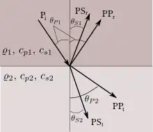 In seismology, a wave conversion specifically refers to the conversion between P and S waves at discontinuities.[4] Body waves are reflected and refracted when they hit a boundary layer within the earth. Here, P-waves can be converted into S-waves (PS-wave) at interfaces, as well as vice versa (SP-wave).[5] Here applies analogously for an incident P-wave: