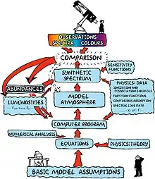 Spectral synthesis programs (e.g. Moog (code)) often use previously generated model photospheres to describe the physical conditions (temperature, pressure, etc...) through which photons must travel to escape the stellar atmosphere. Together with a list of absorption lines and an elemental abundance table, spectral synthesis programs generate synthetic spectra. By comparing these synthetic spectra to observed spectra of distant stars, astronomers can determine the properties (temperature, age, chemical composition, etc...) of these stars.