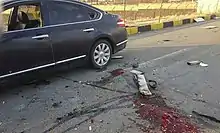 Initial accounts described a Nissan truck, carrying explosives hidden beneath a load of wood, that detonated near Fakhrizadeh's car.[64][65][66][67][note 1] According to Iranian authorities, gunmen then emerged and fired upon Fakhrizadeh's car. In response, Fakhrizadeh's bodyguards clashed with the assailants.[16][53] In the gunfight, three bodyguards were killed and others were wounded. Iranian sources reported that three to four of the attackers were killed.[14][53] This account was partly corroborated by witnesses who spoke to state media.[68] There were also reports of a suicide attacker who later died from his injuries.[69]