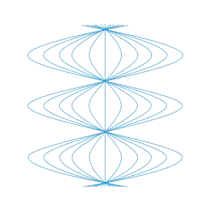 One immediately obtains an integral curve that exhibits sinusoidal expansion and reconvergence cycles. See the figure, in which time is running vertically and one uses the radial symmetry to suppress one spatial dimension. This figure shows why there is a coordinate singularity in the Rosen chart; the observers must pass by one another at regular intervals, which is incompatible with the comoving property, so the chart breaks down at these places. Note that this figure incorrectly suggests that one observer is the 'center of attraction', as it were, but in fact they are all completely equivalent, due to the large symmetry group of this spacetime. Note too that the broadly sinusoidal relative motion of our observers is fully consistent with the behavior of the expansion tensor (concerning the frame field corresponding to our family of observers) which was noted above.