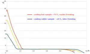 David Auerbach has described an effect that he observed in samples in glass beakers placed into a liquid cooling bath. In all cases the water supercooled, reaching a temperature of typically −6 to −18 °C (21 to 0 °F; 267 to 255 K) before spontaneously freezing. Considerable random variation was observed in the time required for spontaneous freezing to start and in some cases this resulted in the water which started off hotter (partially) freezing first.[11]