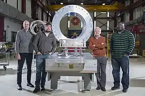 Mu2e, or the Muon-to-Electron Conversion Experiment, is a particle physics experiment at Fermilab in the US.[1] The goal of the experiment is to identify physics beyond the Standard Model, namely, the conversion of muons to electrons without the emission of neutrinos, which occurs in a number of theoretical models.[2][3] Former project co-spokesperson Jim Miller likens this process to neutrino oscillation, but for charged leptons.[4] The rate for this process in the Standard Model of particle physics is unobservably small, so any observation of this process would constitute a major discovery and indicate new physics beyond the standard model.[2] The experiment will be 10,000 times more sensitive than previous muon to electron conversion experiments, and probe effective energy scales up to 10,000 TeV.[2]