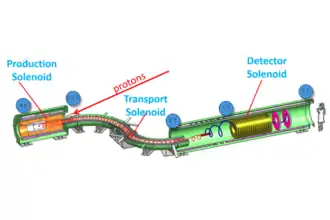 The 4.5-Tesla magnetic field of a production solenoid will direct some of the particles produced into an S-shaped 2-Tesla evacuated transport solenoid, consisting of 50 separate superconducting electromagnets,[14] which will select muons by charge and momentum, and carry the desired slow muons to the detector after some time delay.[3]