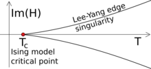 The critical manifold of an Ising model with zero external magnetic field consists of the point at the critical temperature on the temperature axis . In a purely imaginary external magnetic field this critical manifold ramifies into the two branches of the Lee-Yang type, belonging to a different universality class.[1] The Ising critical point plays the role of a multicritical point in this situation (there are no imaginary magnetic fields, but there are equivalent physical situations).