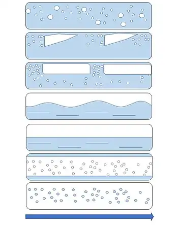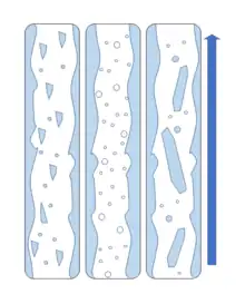 | Slug flow | Defined by the intermittent sequence of liquid 'slugs' containing disperse gas bubbles alternating with longer bubbles with greater width. Unsteady flow regime even when velocities are kept constant.[26] |