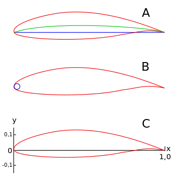 The simplest asymmetric foils are the NACA 4-digit series foils, which use the same formula as that used to generate the 00xx symmetric foils, but with the line of mean camber bent. The formula used to calculate the mean camber line is[4]
