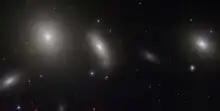 NGC 1277 has been called a "relic of the early universe" due to its stars being formed during a 100 million year interval about 12 billion years ago. Stars were formed at a rate of 1000 times that of the Milky Way galaxy's formation rate in a short burst of time. After this process of stellar formation ran its course, NGC 1277 was left populated with metal-rich stars that are about 7 billion years older than the Sun.[2] It is still uncertain whether or not NGC 1277 is a "relic galaxy"; current studies are still researching the possibility.[4][5] However, observations with Hubble Space Telescope indicate that NGC 1277 lacks metal-poor globular clusters, suggesting that it has accreted little mass over its lifetime and supporting the relic galaxy hypothesis.[6]