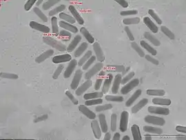In nanotechnology, nanorods are one morphology of nanoscale objects. Each of their dimensions range from 1–100 nm. They may be synthesized from metals or semiconducting materials.[1] Standard aspect ratios (length divided by width) are 3-5. Nanorods are produced by direct chemical synthesis. A combination of ligands act as shape control agents and bond to different facets of the nanorod with different strengths. This allows different faces of the nanorod to grow at different rates, producing an elongated object.