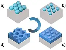 The NSL method generally starts by the preparation of the patterning mask, comprising a self-assembled monolayer array of colloidal nano/micro-particles, followed by the nano/micro-structure production. The method usually involves four main steps, as depicted in the sketch, allowing the formation of different geometries. The variety of techniques that can be used for the colloidal array formation, as well as for the subsequent structure production, shows the high versatility of this method for implementation in various applications. For instance, it is a preferential soft-lithography technique to micro-pattern photovoltaic devices, to produce structures allowing light-management[13][14] and/or self-cleaning.[15][16]