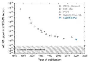 The latest best limit of |dn| < 1.8×10−26 e⋅cm has been published 2020 by the nEDM collaboration at Paul Scherrer Institute (PSI).[1]