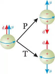 A permanent electric dipole moment of a fundamental particle violates both parity (P) and time reversal symmetry (T). These violations can be understood by examining the neutron's magnetic dipole moment and hypothetical electric dipole moment. Under time reversal, the magnetic dipole moment changes its direction, whereas the electric dipole moment stays unchanged. Under parity, the electric dipole moment changes its direction but not the magnetic dipole moment. As the resulting system under P and T is not symmetric with respect to the initial system, these symmetries are violated in the case of the existence of an EDM. Having also CPT symmetry, the combined symmetry CP is violated as well.