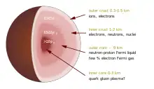 Proceeding inward, one encounters nuclei with ever-increasing numbers of neutrons; such nuclei would decay quickly on Earth, but are kept stable by tremendous pressures. As this process continues at increasing depths, the neutron drip becomes overwhelming, and the concentration of free neutrons increases rapidly. In that region, there are nuclei, free electrons, and free neutrons. The nuclei become increasingly small (gravity and pressure overwhelming the strong force) until the core is reached, by definition the point where mostly neutrons exist. The expected hierarchy of phases of nuclear matter in the inner crust has been characterized as "nuclear pasta", with fewer voids and larger structures towards higher pressures.[56] The composition of the superdense matter in the core remains uncertain. One model describes the core as superfluid neutron-degenerate matter (mostly neutrons, with some protons and electrons). More exotic forms of matter are possible, including degenerate strange matter (containing strange quarks in addition to up and down quarks), matter containing high-energy pions and kaons in addition to neutrons,[21] or ultra-dense quark-degenerate matter.