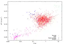 P and P-dot can also be combined with neutron star's moment of inertia to estimate a quantity called spin-down luminosity, which is given the symbol (E-dot). It is not the measured luminosity, but rather the calculated loss rate of rotational energy that would manifest itself as radiation. For neutron stars where the spin-down luminosity is comparable to the actual luminosity, the neutron stars are said to be "rotation powered".[57][58] The observed luminosity of the Crab Pulsar is comparable to the spin-down luminosity, supporting the model that rotational kinetic energy powers the radiation from it.[57] With neutron stars such as magnetars, where the actual luminosity exceeds the spin-down luminosity by about a factor of one hundred, it is assumed that the luminosity is powered by magnetic dissipation, rather than being rotation powered.[65]