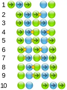 A cradle that best follows the simple solution needs to have an initial separation between the balls that measures at least twice the amount that any one ball compresses, but most do not. This section describes the action when the initial separation is not enough and in subsequent collisions that involve more than two balls even when there is an initial separation. This solution simplifies to the simple solution when only two balls touch during a collision. It applies to all perfectly elastic identical balls that have no energy losses due to friction and can be approximated by materials such as steel, glass, plastic, and rubber.