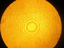 A similar analysis for illumination of the device from below instead of from above shows that in this case the central portion of the pattern is bright, not dark, as shown in Fig. 1. When the light is not monochromatic, the radial position of the fringe pattern has a "rainbow" appearance, as shown in Fig. 5.