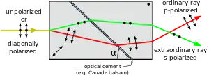 A Nomarski prism is a modification of the Wollaston prism that is used in differential interference contrast microscopy. It is named after its inventor, Polish and naturalized-French physicist Georges Nomarski. Like the Wollaston prism, the Nomarski prism consists of two birefringent crystal wedges (e.g. quartz or calcite) cemented together at the hypotenuse (e.g. with Canada balsam). One of the wedges is identical to a conventional Wollaston wedge and has the optical axis oriented parallel to the surface of the prism. The second wedge of the prism is modified by cutting the crystal so that the optical axis is oriented obliquely with respect to the flat surface of the prism. The Nomarski modification causes the light rays to come to a focal point outside the body of the prism, and allows greater flexibility so that when setting up the microscope the prism can be actively focused.