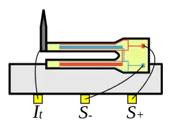 A qPlus sensor is used in many ultra-high vacuum nc-AFMs. The sensor was originally made from a quartz tuning fork from a wristwatch. In contrast to a quartz tuning fork sensor that consists of two coupled tines that oscillate opposed to each other, a qPlus sensor has only one tine that oscillates. The tuning fork is glued to a mount such that one tine of the tuning fork is immobilised, a tungsten wire, etched to have a sharp apex, is then glued to the free prong.[10] The sensor was invented in 1996[11] by physicist Franz J. Giessibl. The AFM deflection signal is generated by the piezoelectric effect, and can be read from the two electrodes on the tuning fork.