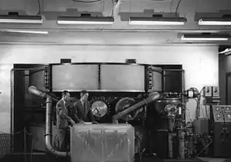 Plans for the delivery of the weapons in combat were assigned to the Weapons Committee, which was chaired by Ramsey and answerable to Captain William S. Parsons.[18] Ramsey drew up tables of organization and equipment for the Project Alberta detachment that would accompany the USAAF's 509th Composite Group to Tinian. Ramsey briefed the 509th's commander, Lieutenant Colonel Paul W. Tibbets, on the nature of the mission when the latter assumed command of the 509th.[19] Ramsey went to Tinian with the Project Alberta detachment as Parsons's scientific and technical deputy. He was involved in the assembly of the Fat Man bomb and relayed Parsons's message indicating the success of the bombing of Hiroshima to Groves in Washington, D.C.[20]